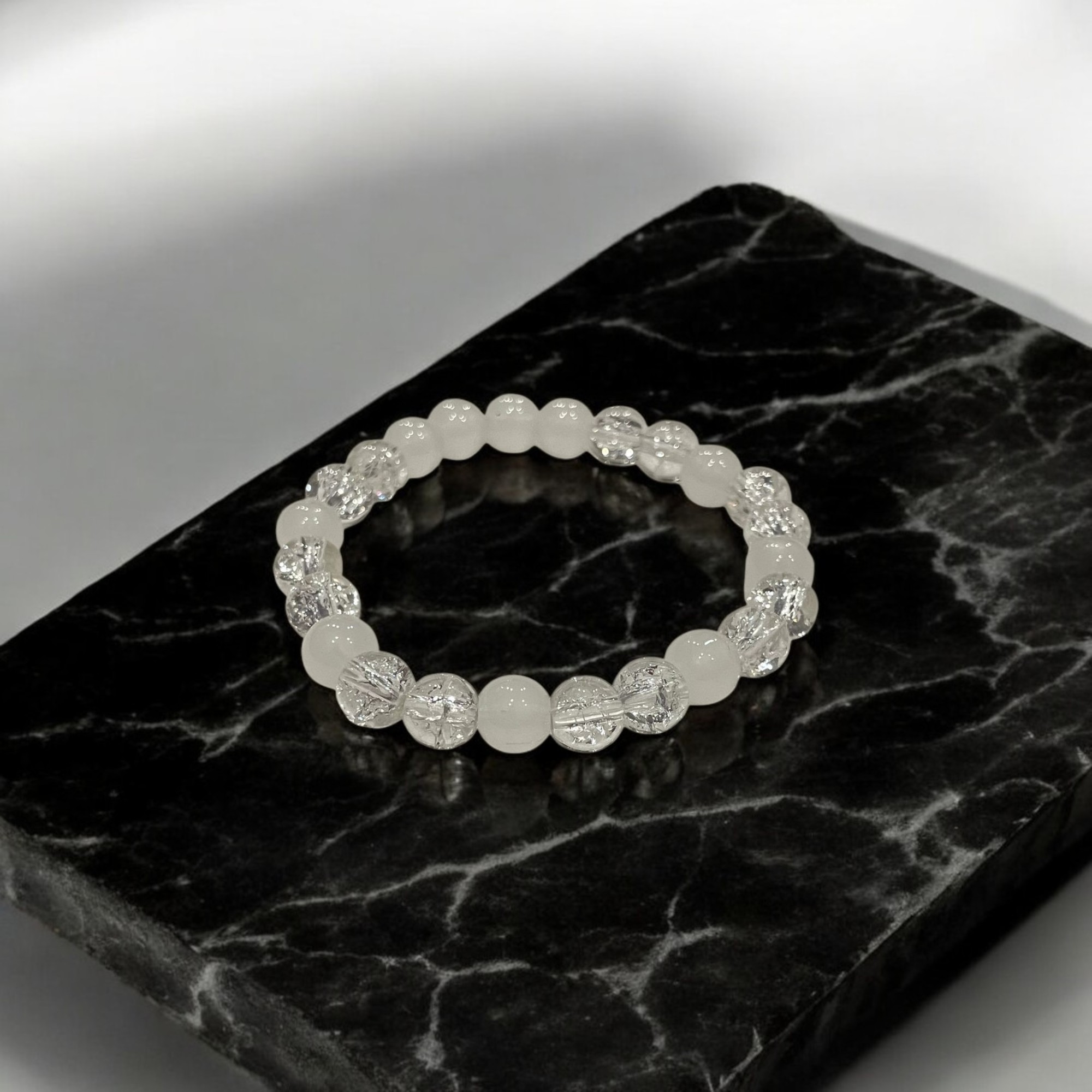 Ethereal and elegant, this bracelet pairs frosted and clear beads like moonlit dew drops ✨ A subtle touch of glamour for any occasion.