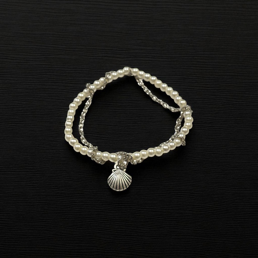 Embrace coastal vibes with this elegant layered pearl and chain bracelet, finished with a delicate seashell charm.