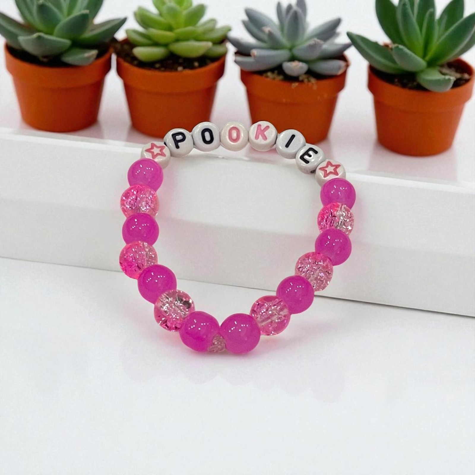 This vibrant bracelet is designed to turn heads with its lively fuchsia beads that radiate bold energy and charm. 💖✨ Clear sparkling accents add just the right touch of brilliance, creating a dazzling contrast that makes the piece truly eye-catching. 💎 What makes it extra special is the personalized “Pookie” detail, giving it a unique and heartfelt flair that sets it apart. 🌸 Perfect for anyone who loves statement accessories, it adds a playful yet stylish pop of color to any outfit. 🌟 Lightweight and comfortable, it’s ideal for daily wear or as a fun gift that celebrates individuality and personal style. 🎁💫 A bracelet that combines bold color, sparkle, and customization for a one-of-a-kind look! 🌈