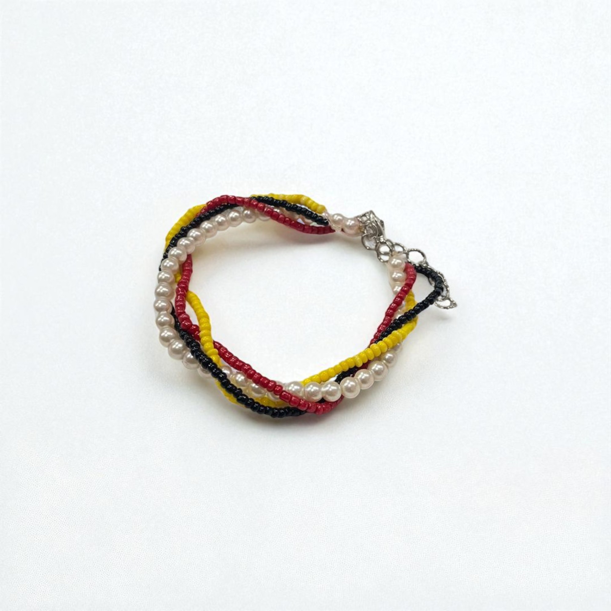 This striking bracelet is designed to stand out with its bold and vibrant mix of colors. ✨ Featuring red, yellow, and black seed beads intricately twisted together, it creates a lively yet elegant pattern that instantly catches the eye. ❤️💛🖤 Delicate pearls are woven into the design, adding a touch of classic sophistication and balance to the playful hues. 🤍 Perfectly versatile, it transitions seamlessly from casual everyday wear to more polished, special occasion looks. 🌟